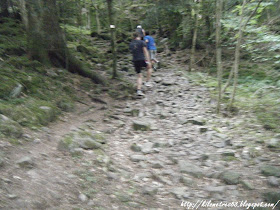 Une passerelle puis une seconde, des rochers, des racines, c’est le pied! Peu avant le 4eme kilomètres Gregus parti prudemment me double. Il semble bien et attaque en grande forme la partie la plus dure de la course qui se dresse désormais devant nous.